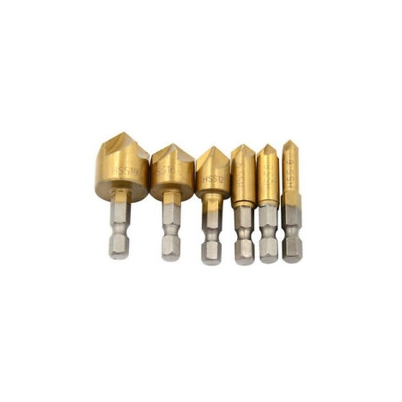 6PCS 1/4inch 90 Degree HSS 5 Flute Countersink Drill Bit Set, Size includes - 6mm(1/4inch), 8mm(5/16inch), 9mm(3/8inch), 12mm(1/2inch), 16mm(5/8inch), 19mm(3/4inch).