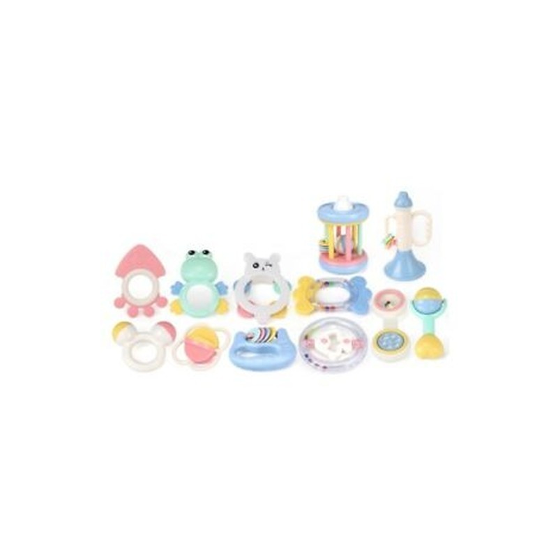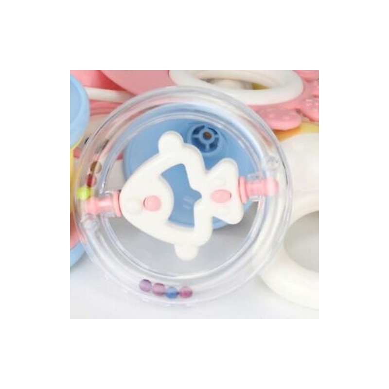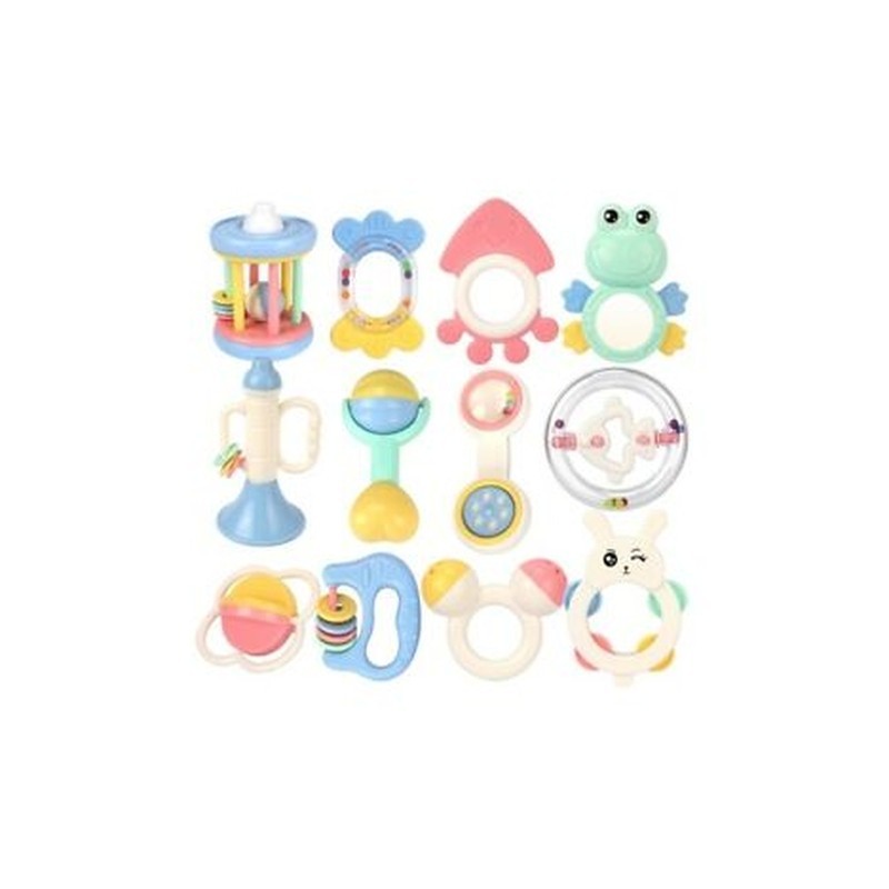 6X(Rattles set a total of 12 fun different cartoon styles, soft colors, clear sound, very popular with the baby. Soft teethers can slow down the baby tooth are not comfortable during the growing season.