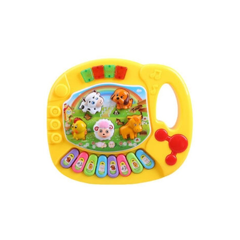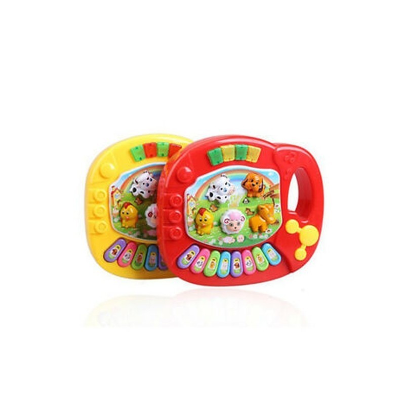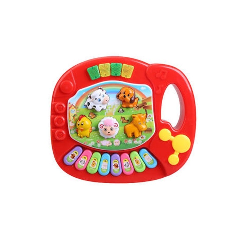 Kid`s animal farm piano music toy, upper part with handle, and dogs, lamb, chicken, dallas, pony five animals button.