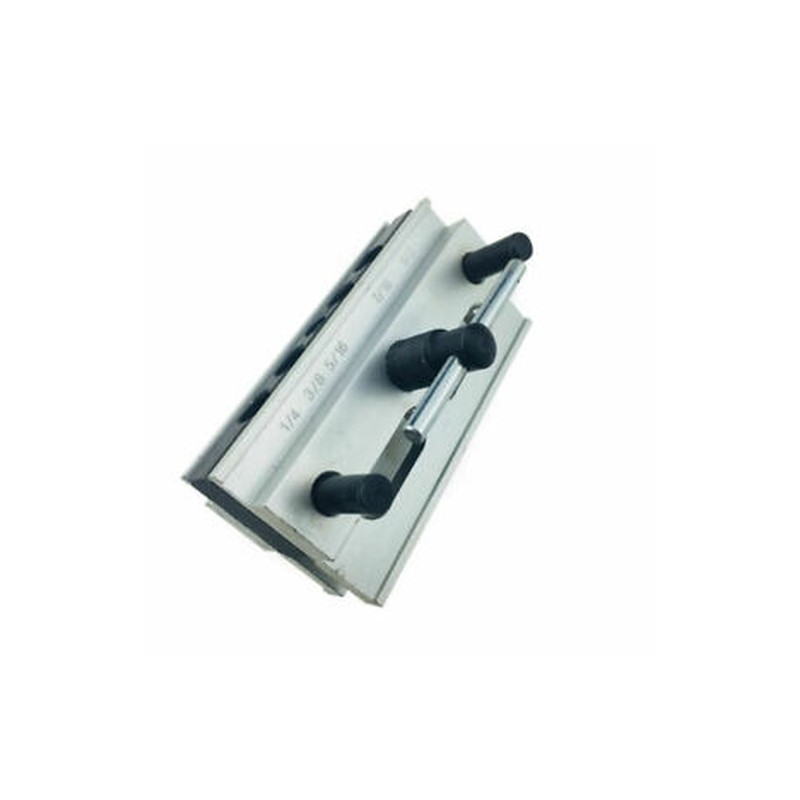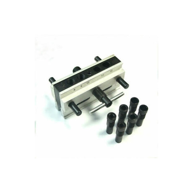 Note: there are 4 holes along the top of the jig. Only 2 of the holes accept threaded bushings that are provided. The other two holes accept 7/16 inch and 1/2 inch drill bits.