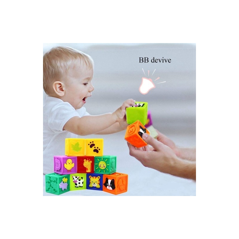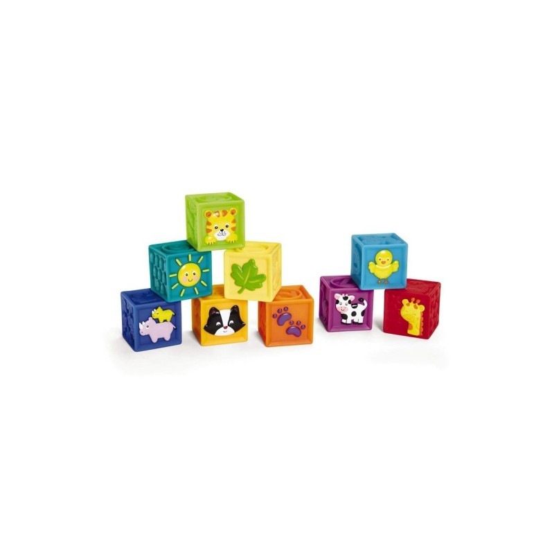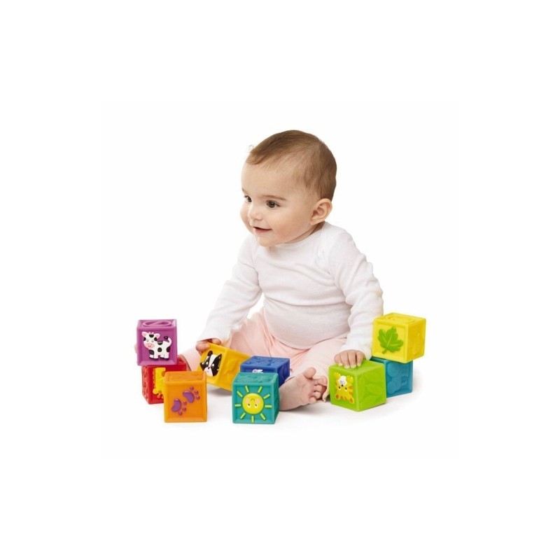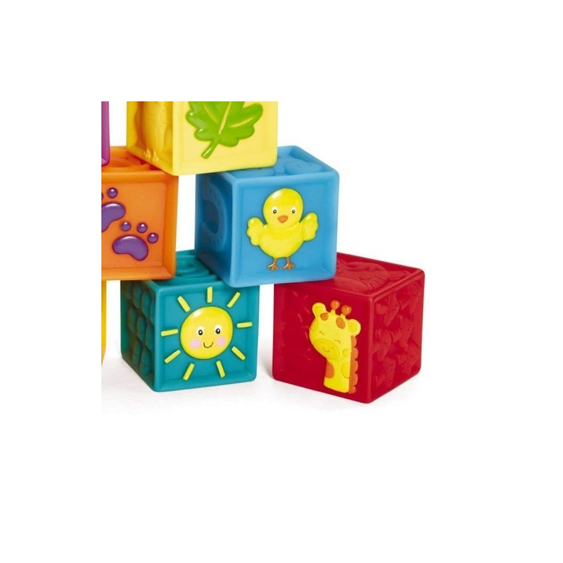 FUN COLORS AND TEXTURES: Each block features a different bright and enticing color that your baby will love. They have an embossed animal, shape or character on one side to help with recognition. The other sides have textured shapes for six sides of sensory development for your baby.