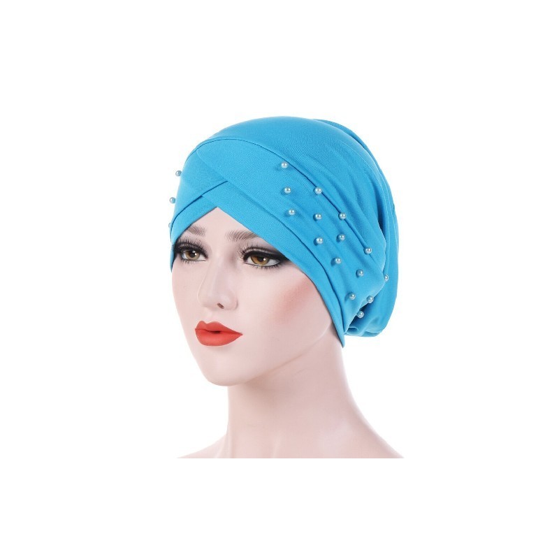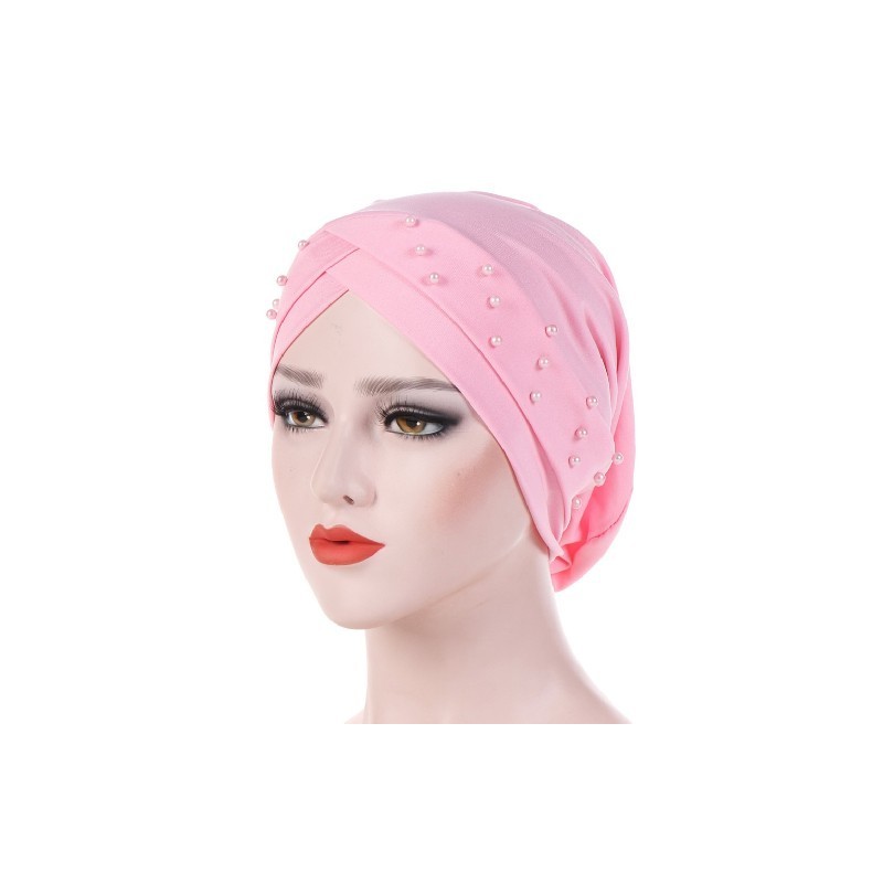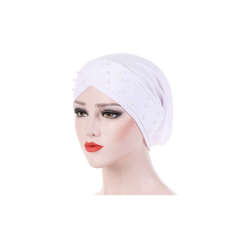Fashion Stretch Cotton Forehead Cross Turban Hat Women Bandana Beaded Headwear With Imitate Pearl Chemo Cap Female India Hat Cap