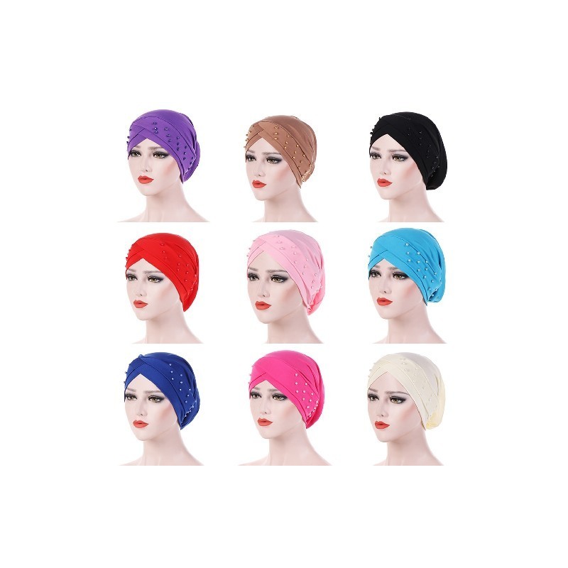 Divatos sztreccs pamut homlokkeresztes turbánsapka női bandana gyöngyökkel díszített fejfedő gyöngyházutánzattal, női indiai kalapsapka
