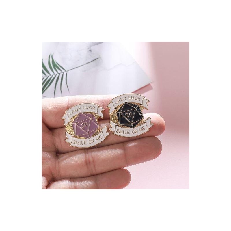 D20 sided dice Dungeons and Dragons Enamel Pin LADY LUCK,SMILE ON ME Brooches Lapel Badge for women Men D20 DnD Game Jewellery