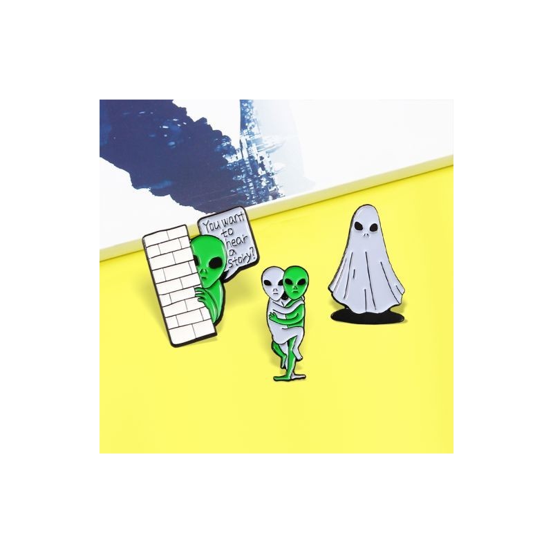 Funny Alien And Ghost Enamel Pin Alien ET "Akarsz hallani egy történetet?" Bross hajtóka szerelmeseknek legjobb barát jelvény ékszer ajándék