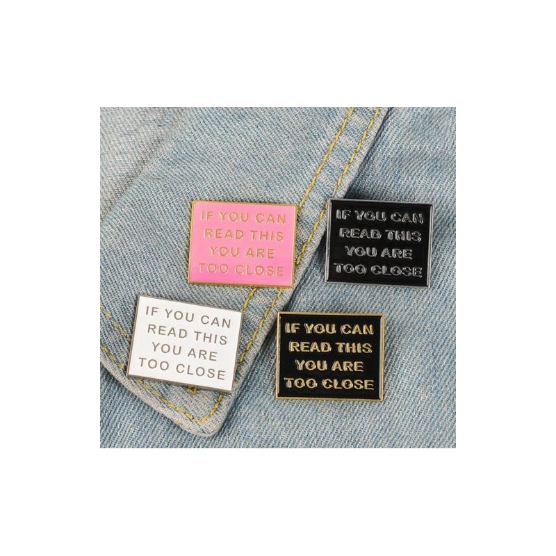Fun enamel pin TOO CLOSE badge brooch Black White Pink Board Lapel pin Denim Jeans shirt bag Cartoon Jewellery Gift for friends