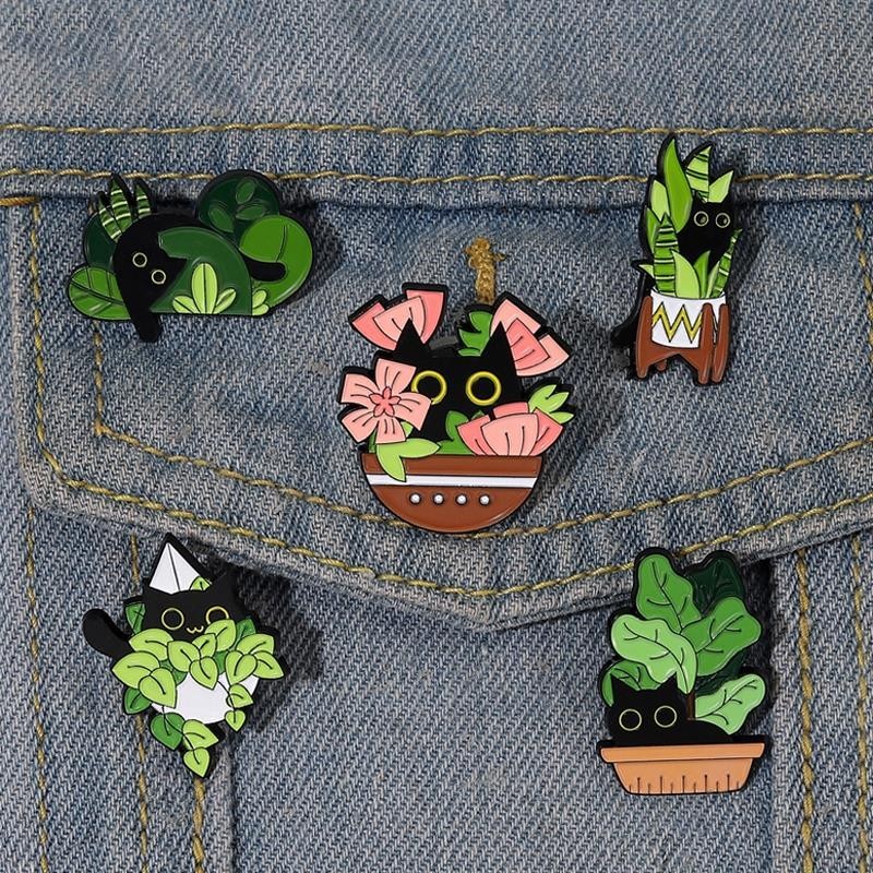 Cats in Plants Enamel Pins Custom Black Cat Potted Plant Brooches Lapel Badges Fun Animal Plant Jewellery Gift for Kids Friends