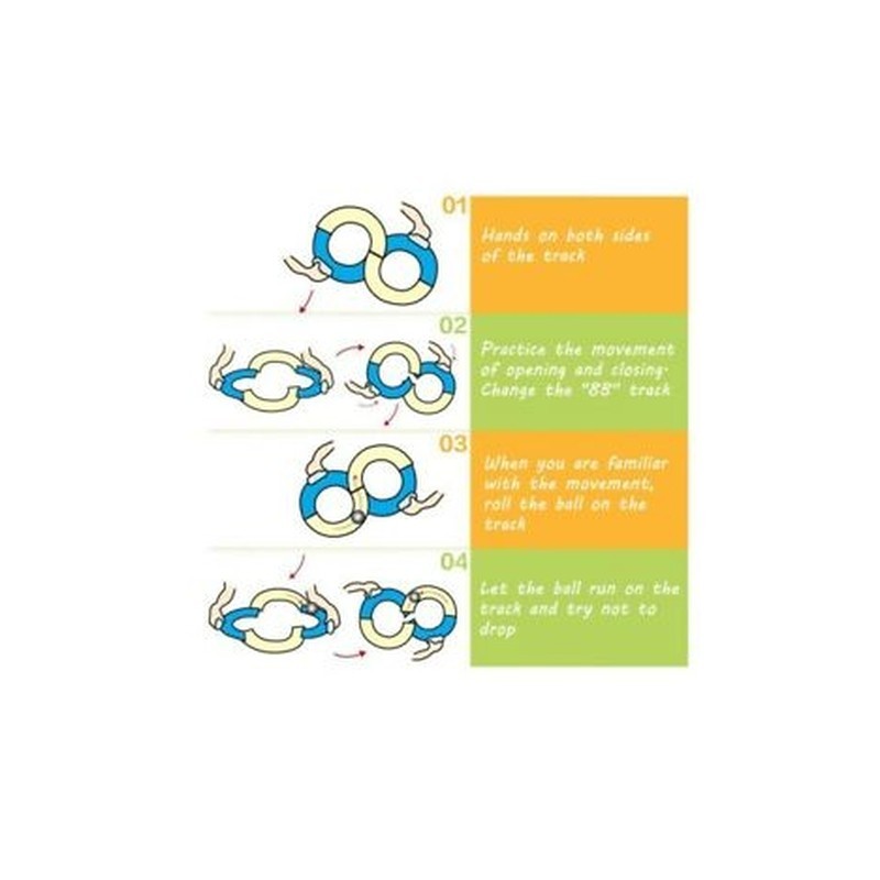 Both hands on both sides of the handle,practice open and close action Familiar with the action after,place the ball on the track to rolling, when the ball rolls to the end of the S-shaped track,change the orbital direction Let the ball continue to move in orbit,try not to drop.