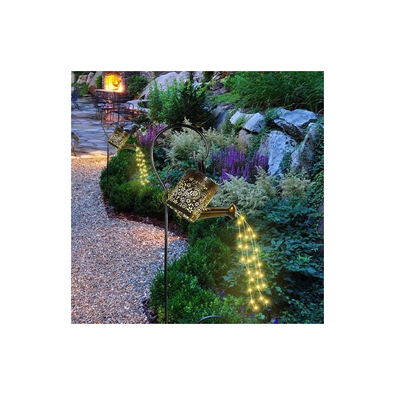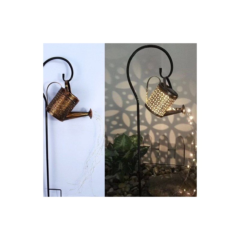 1.A watering can with a fairy lamp string:Decorate your outdoor garden with Warm White lights. courtyard lamps have a special retro style, iron watering can with hollow design will project a charming pattern at night, soft light adds a lot of beauty to garden at night. Choose a special place in garden or yard. At night, solar lights of watering can looks like elf-like lights, both romantic and magical.