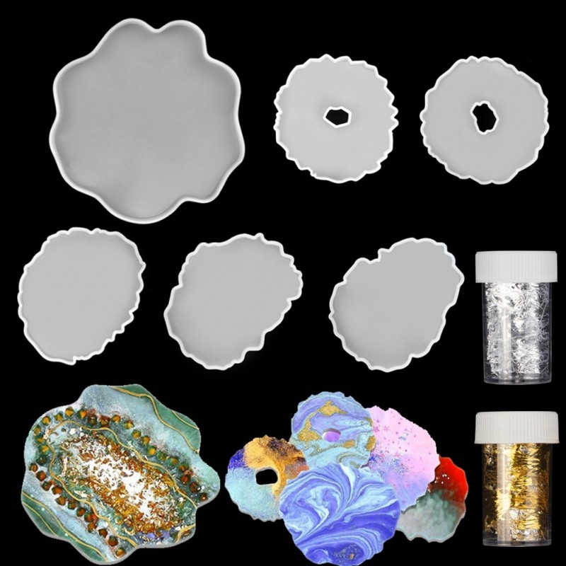 6 Pack Silicone Geode Coaster Epoxy Resin Molds Set with 2 Bottles of Gold Foil Flakes for DIY Resin Casting Geode Tray Mold, Geode Agate Coasters, Home Decoration