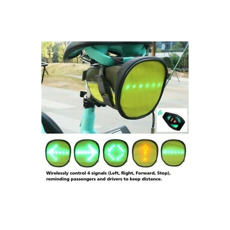 The bicycle saddle bag with turn signal is designed in order to illustrate traffic signals such as the cruise signal, stop signal and emergency signal. It provides you with a simple controller that can transmit basic signals on the LED display for others who are driving or walking around you. Simply using the detachable wireless controller enables various signals such as directions and emergency indicators to keep your safe on the road.