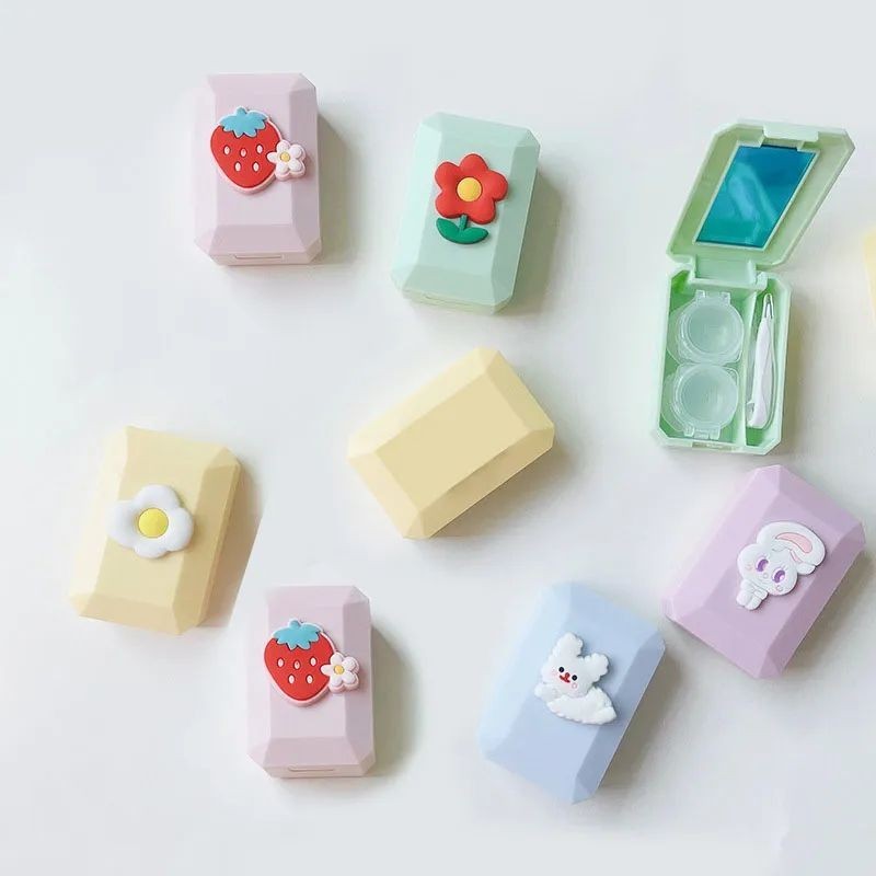 Cartoon Contact Lens Cases with Mirror Cute Contact Lens Box Square Women Travel Contact Lenses Kit Container Case