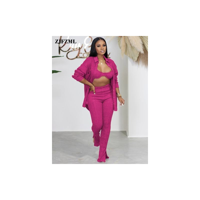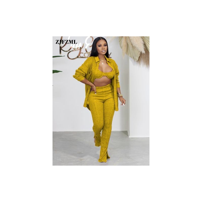 Chic Chunky Knit Sweater 3 Piece Matching Set Cleavage Bra Top Turn Down Collar Long Sleeve Jacket High Waist Split Hem Pant