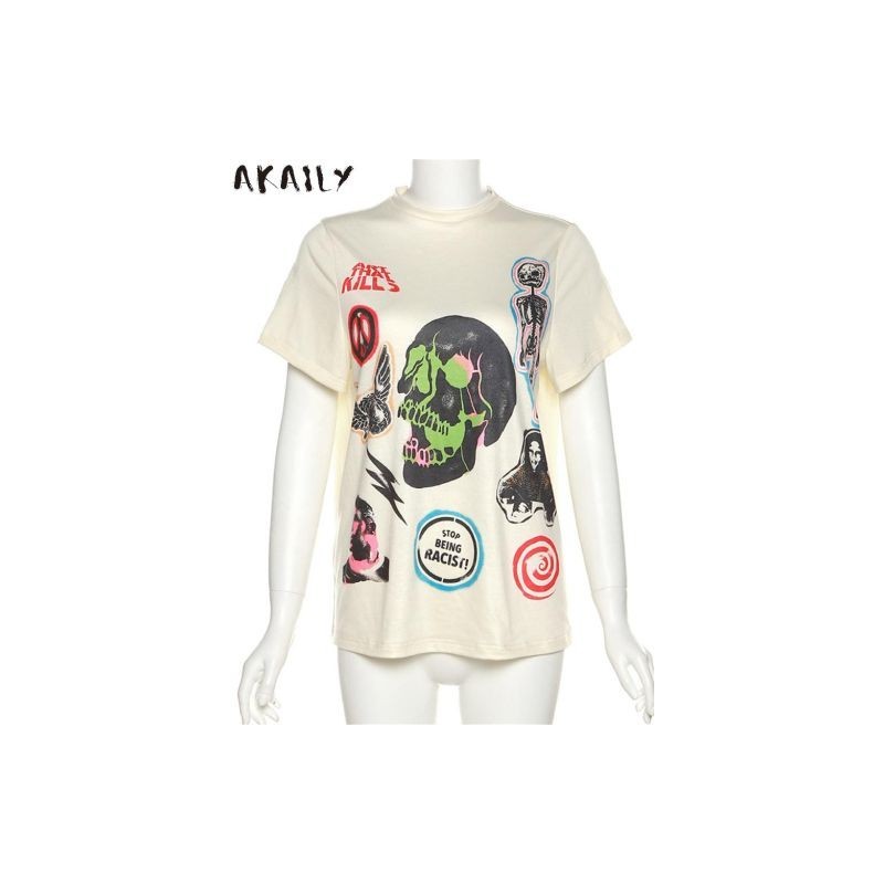 Akaily Summer Streetwear O Neck Print Tops For Women 2023 Crop Top Short Bodycon T Shirts Causal Graphic Panelled T Shirts