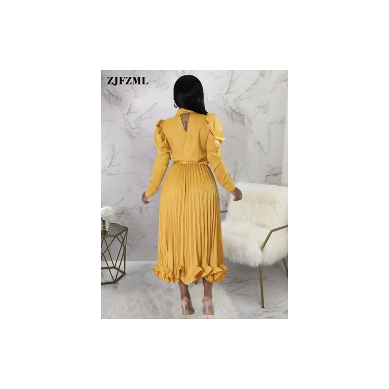 Elegáns, divatos, kétrészes szoknya szett nőknek, nyakú, pufi hosszú ujjú ing felső és magas derekú, fodros szegély, redőzött maxi ruha