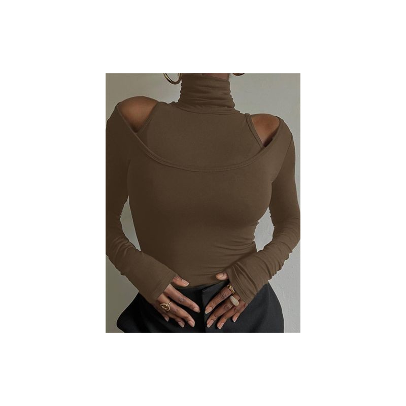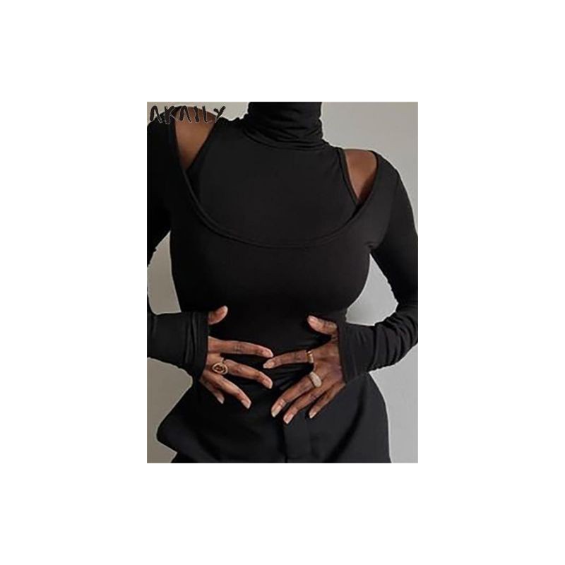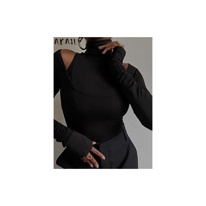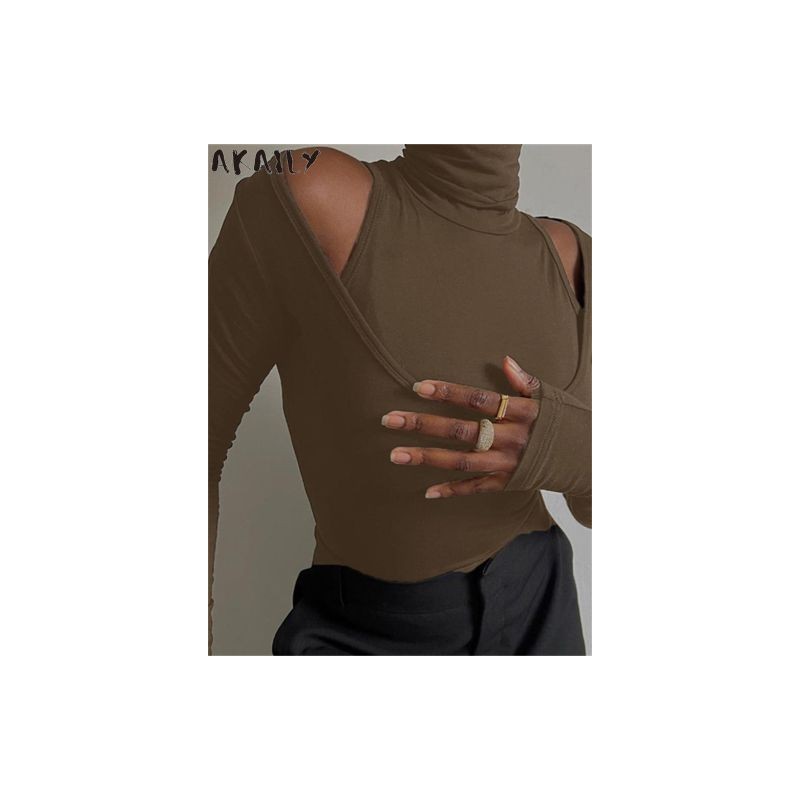 Akaily Fall Black Hollow Out T Shirt For Women Fashion 2022 Turtleneck Long Sleeve Y2K Tops Ladies Brown Crop Top And Tee Shirt
