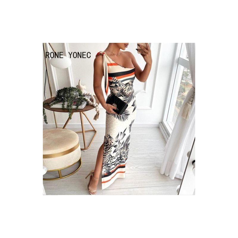 Women Elegant Dress All Over Print One Shoulder Side Slit Maxi Dress Summer Dress