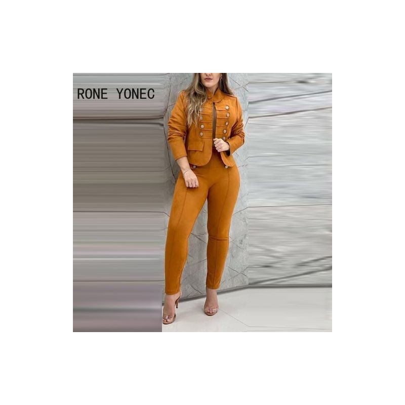 Women Solid Elegant button Stand Collar Short Tops Skinny Pencil Pants Blazer Sets