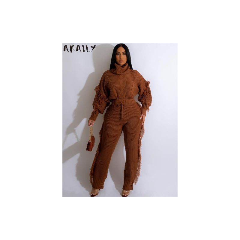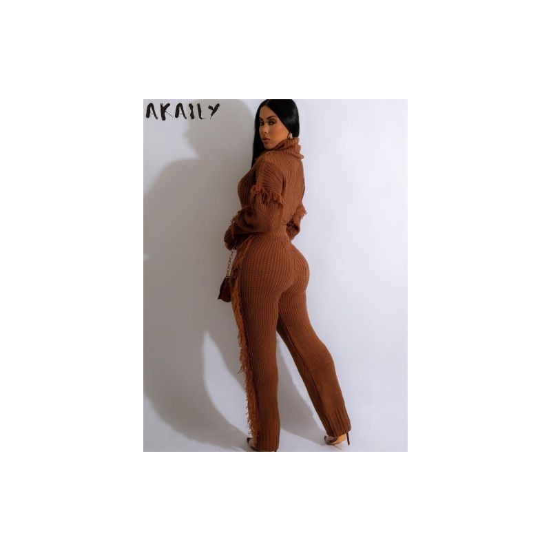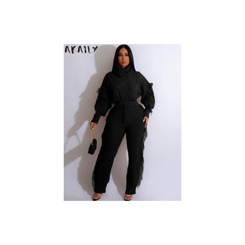 Akaily Fall Winter Black Knitted 2 Two Piece Sets Womens Outfits 2022 Brown Tassel Long Sleeve Sweater And Pants Sets Ladies