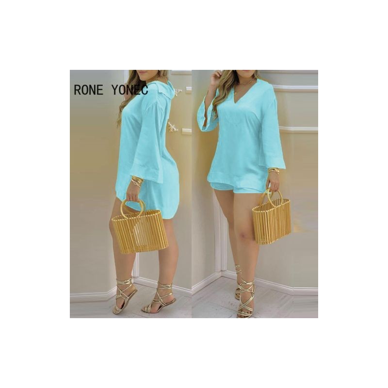 Női, kétrészes szett tömör sima harangujjú, V-nyakú felső és rövidnadrág szett Outfit nyári öltöny