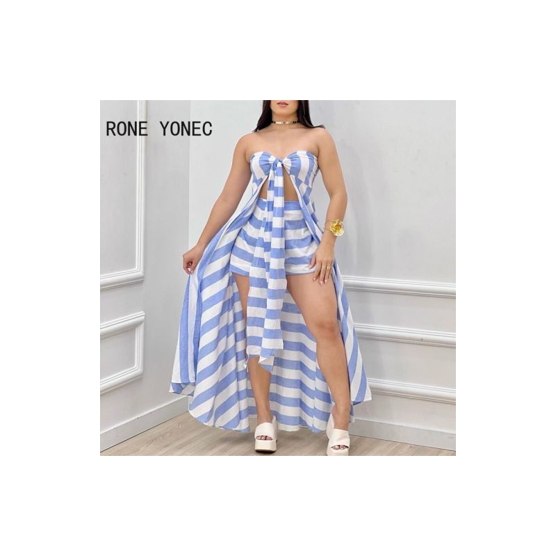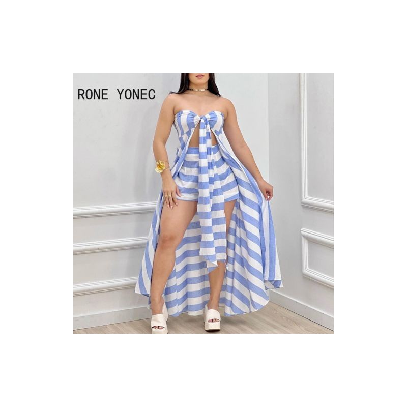 Women Elegant Striped Strapless Sleeveless Sexy Asymmetrical X-long Top Sexy Short Sets