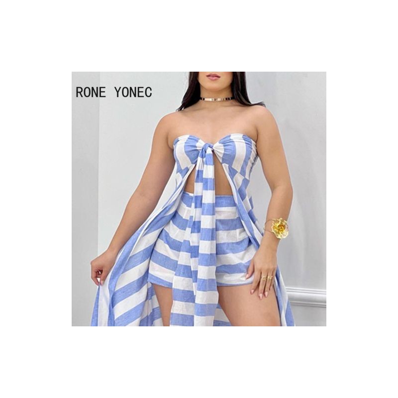 Női elegáns csíkos, pánt nélküli ujjatlan szexi aszimmetrikus X-hosszú felső szexi rövid szettek