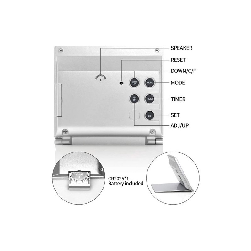 4. Functional design: our foldable LCD clocks only have 5 buttons on back but 4 modes, normal time mode, sleeping mode with music, timer mode and temperature mode, includes date, week, time (12/ 24 hour), alarm setting , snooze (range from 1-60 minutes), indoor temperature (°C/ °F) and so on.