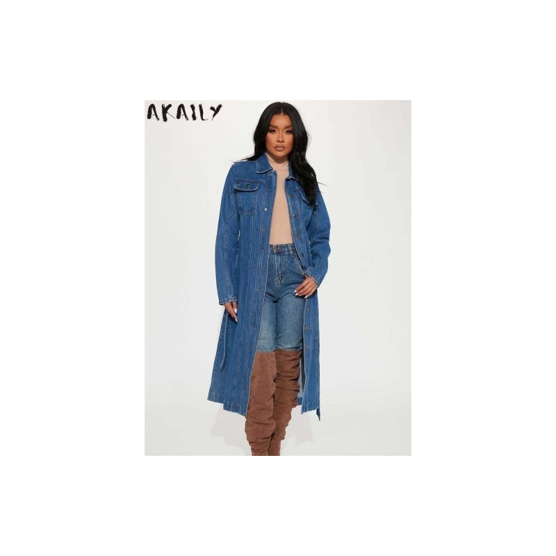 Akaily Fall Denim Long Cardigans For Women Fashion 2022 Long Sleeve Bandage Jeans Jackets Ladies Loose Casual Long Trench Coat