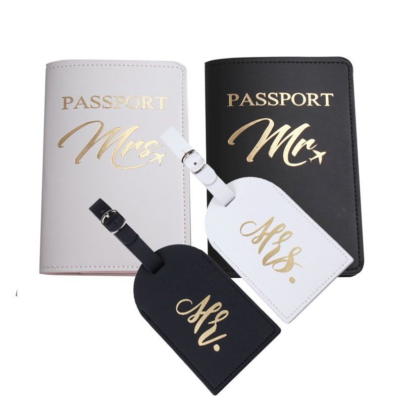 2 db/szett PU bőr csomagtartó címkék Útlevél borító tok Pénztárca pároknak Nászutas esküvői ajándék utazási kártyatartó Szervező