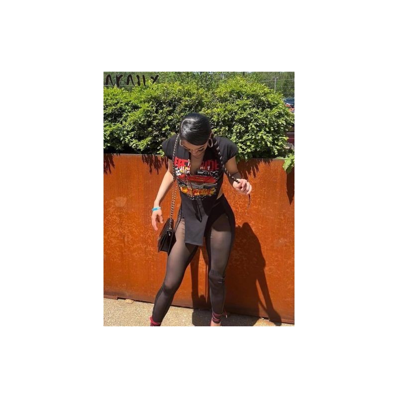 AKAILY Summer Streetwear Grafikus pólók női 2022 V nyakú, rövid ujjú nyomtatott felsők női aszimmetrikus betűs pólók női