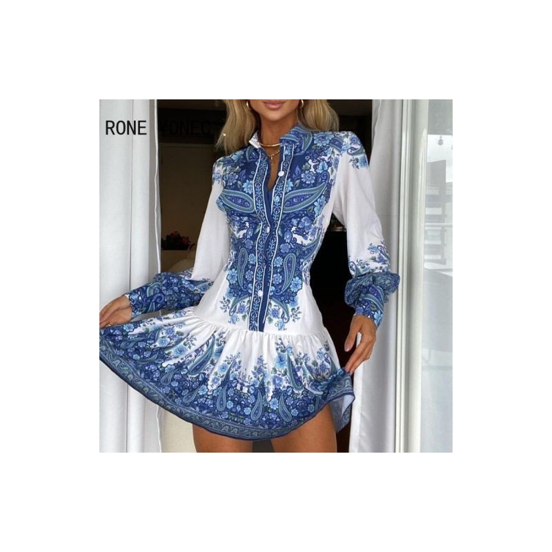 Women Casual All Over Print button Long sleeve Pleated Mini shirt Dresses
