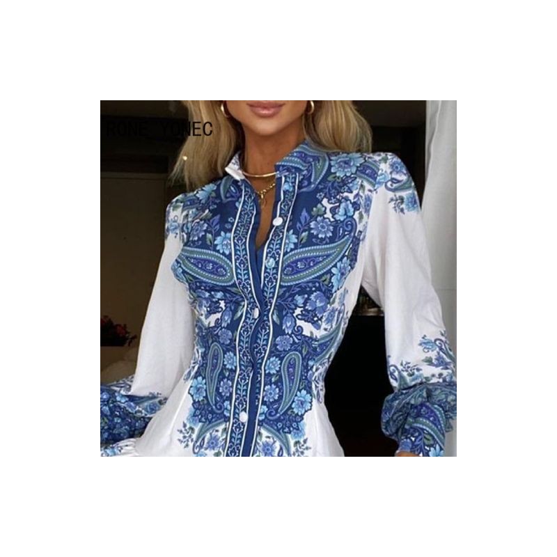 Női Alkalmi All Over Print gomb Hosszú ujjú redős mini ing ruhák