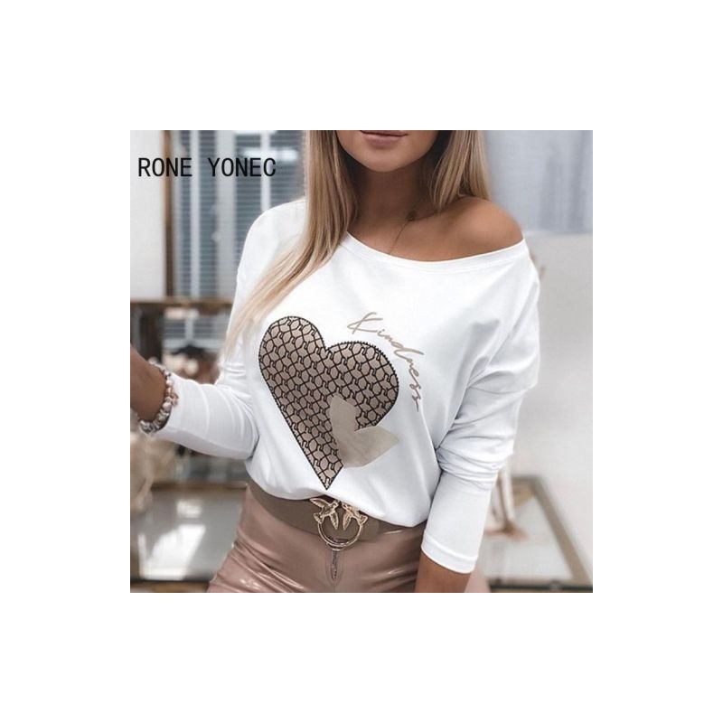 Női elegáns alkalmi grafikus kerek nyakú, denevérszárnyú ujjú szívmintás tavaszi fehér blúz felsők
