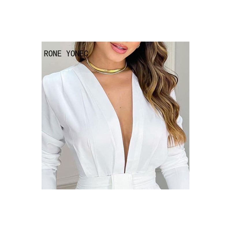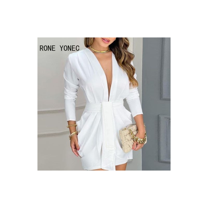 Női elegáns, elegáns hosszú ujjú, mély V nyakú, mini fodros, formális parti és munkafehér ruhák