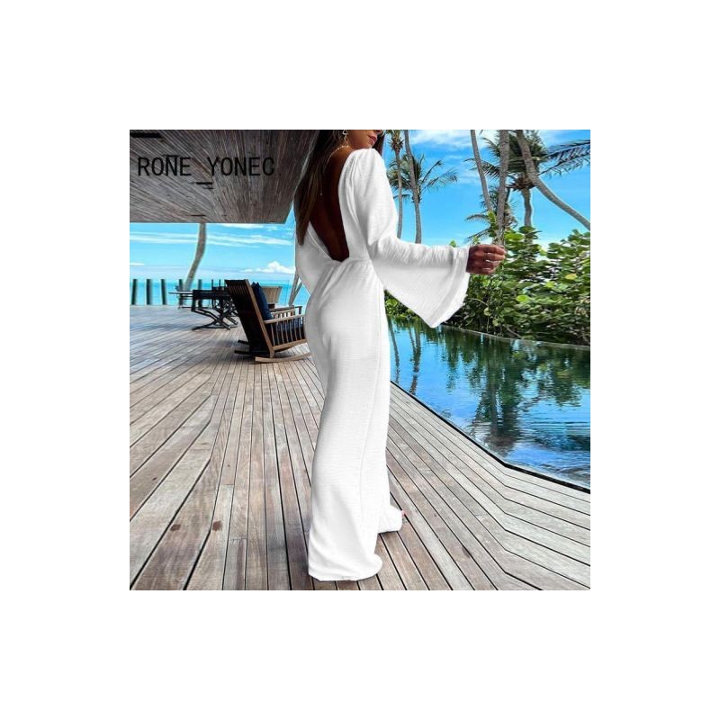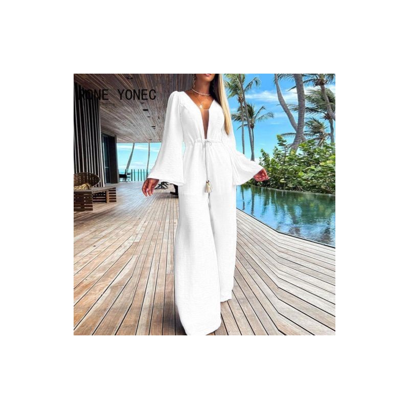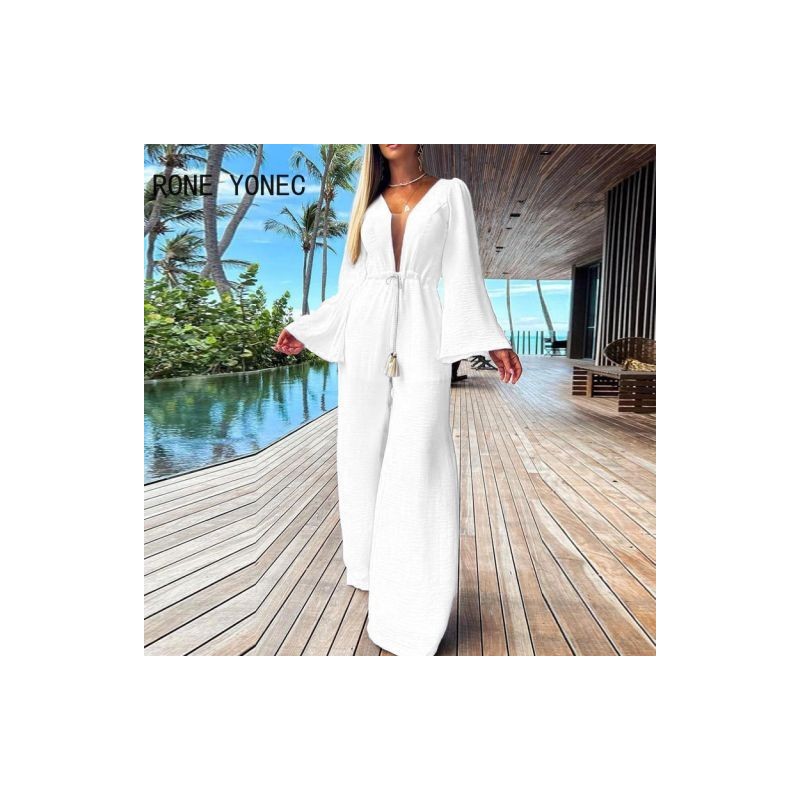 Women Elegant Contrast Mesh Patch Perspective Long Flare Sleeves Drawstring Straight Jumpsuit