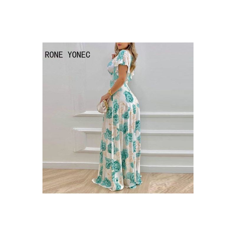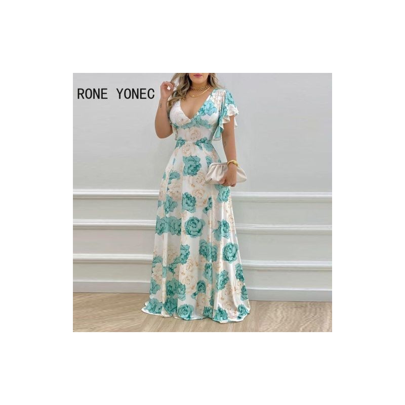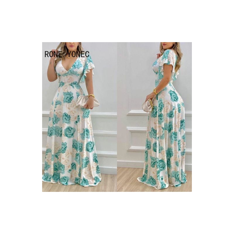Női elegáns sifon, mély V-nyakú virágmintás, pillangós ujjú, maxi fehér vakációs ruhák