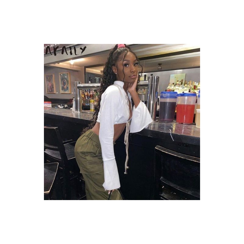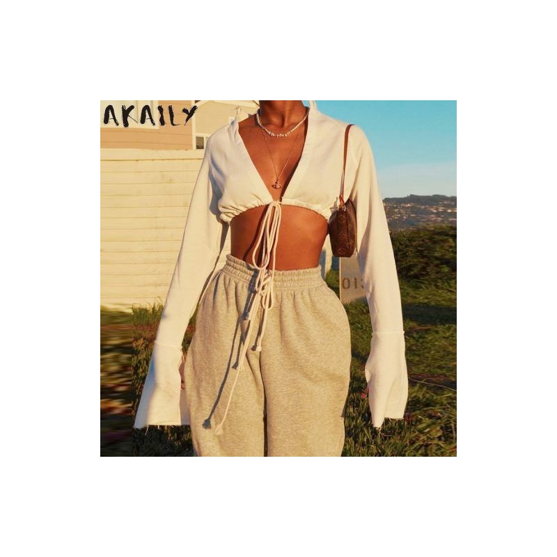 Akaily Summer Streetwear White V Neck Bandage Tops Women Slim Flare Sleeve Drawstring Crop Top Female Casual Blouse Outfit 2021