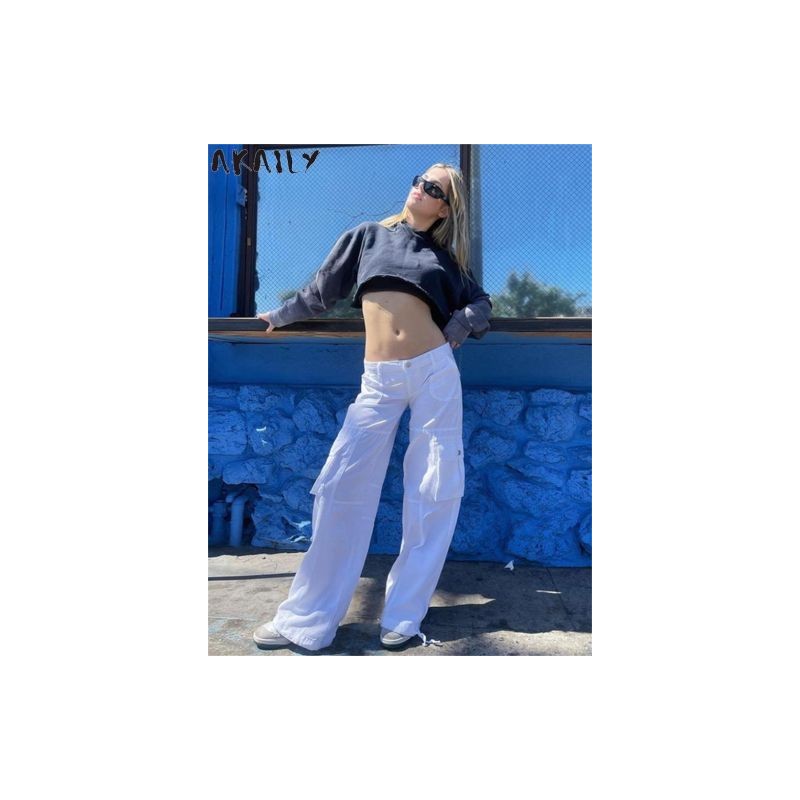Akaily Summer Street Black Cargo Baggy Pants Női 2022 Fehér zsebes Hosszú nadrág Női Alacsony derékú, Egyenes, széles lábú nadrág