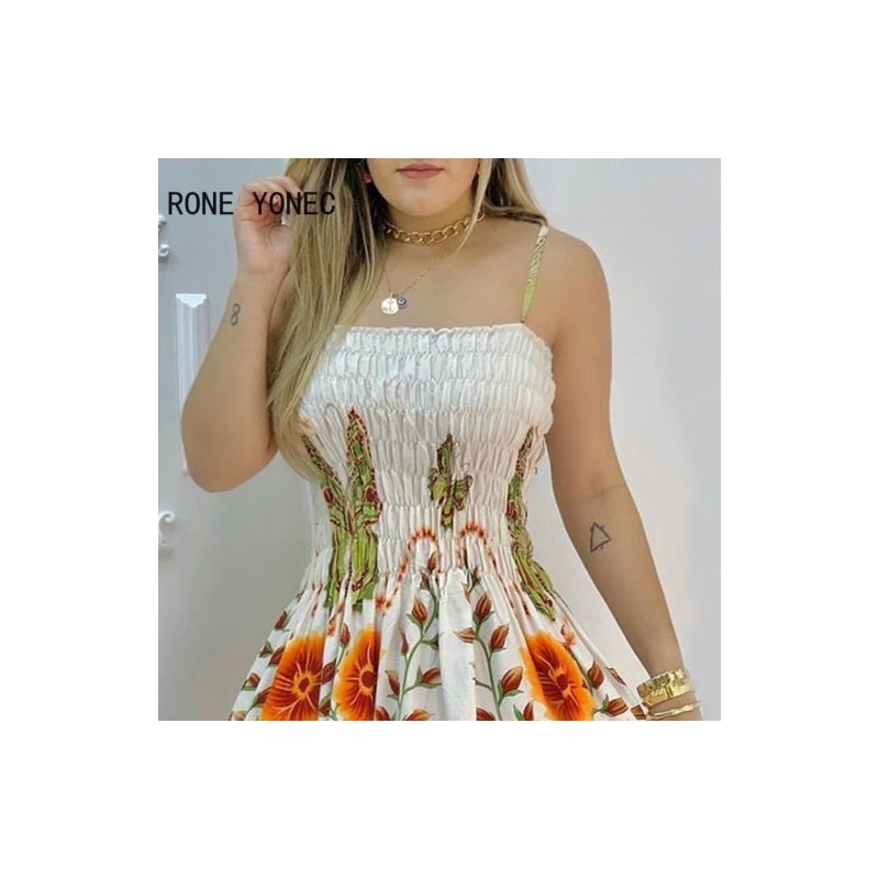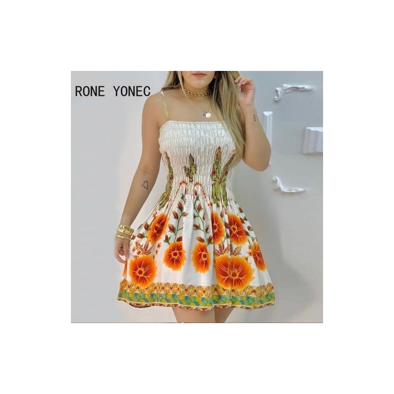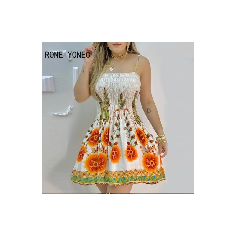 Women Elegant Dress Floral Print Spaghetti Strap Shirred Dress Casual Summer Mini Dress