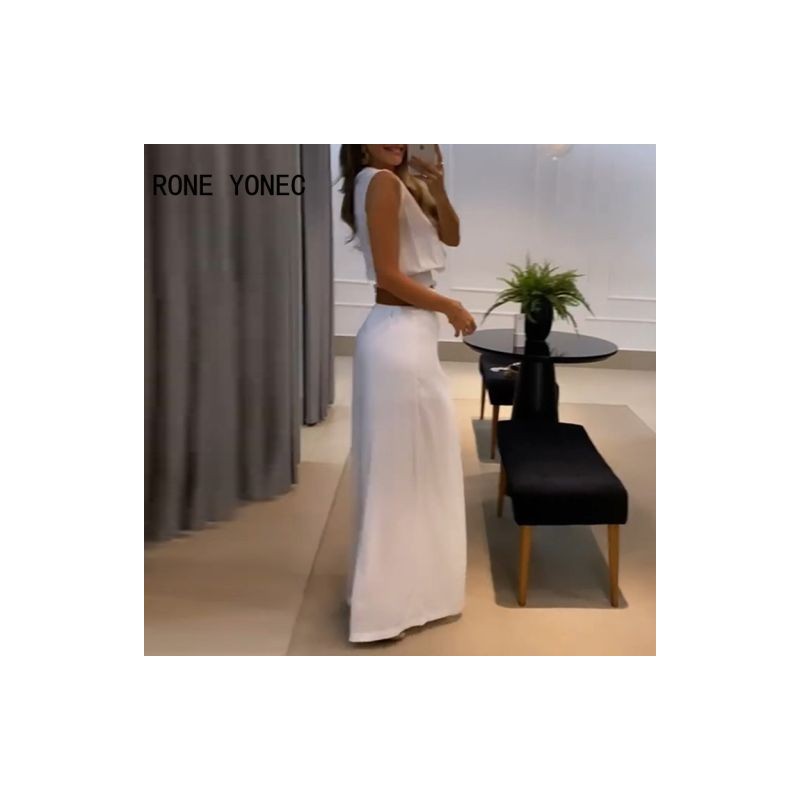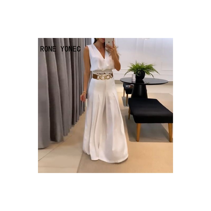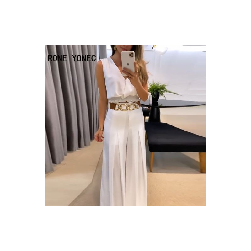 Női alkalmi tank, mély V nyakú, tömör termés felsők övvel, széles szárú nadrág szett