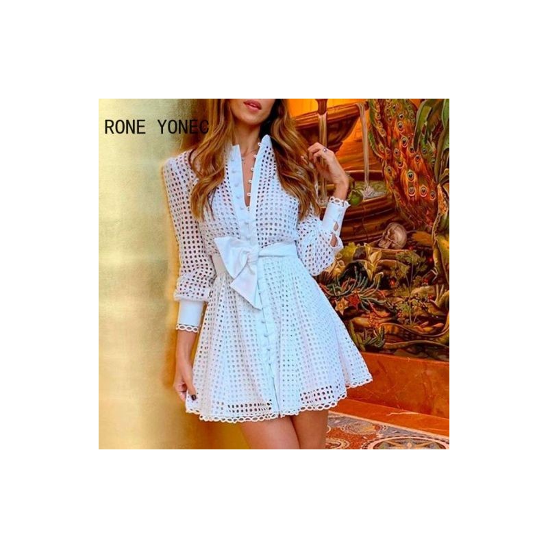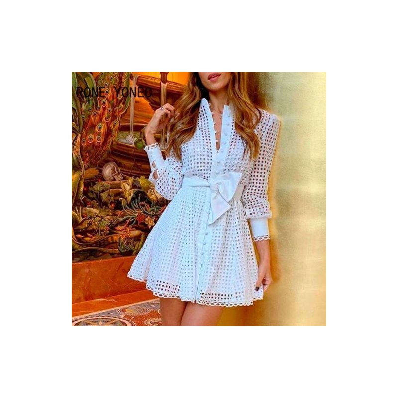 Women Elegant Dress Hollow Out Button Design Long Sleeve Shirt Dress Lace Dress Patry Dress