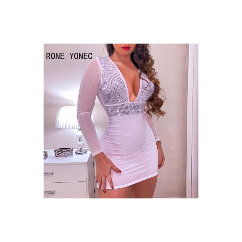 Női tömör szexi mély V nyakú strasszos hosszú ujjú hálós patchwork Bodycon mini szexi parti fehér ruhák