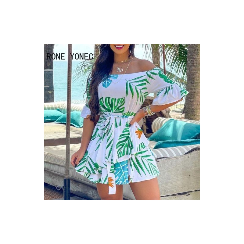 Women Off Shoulder Palm Leaf Print Casual Dress Vacation Dress 2021