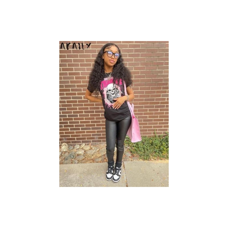 Akaily Black Letter Printing Graphic T Shirts Female Summer Outfit For Women 2023 Streetwear White Tees Casual Slim Tops Female