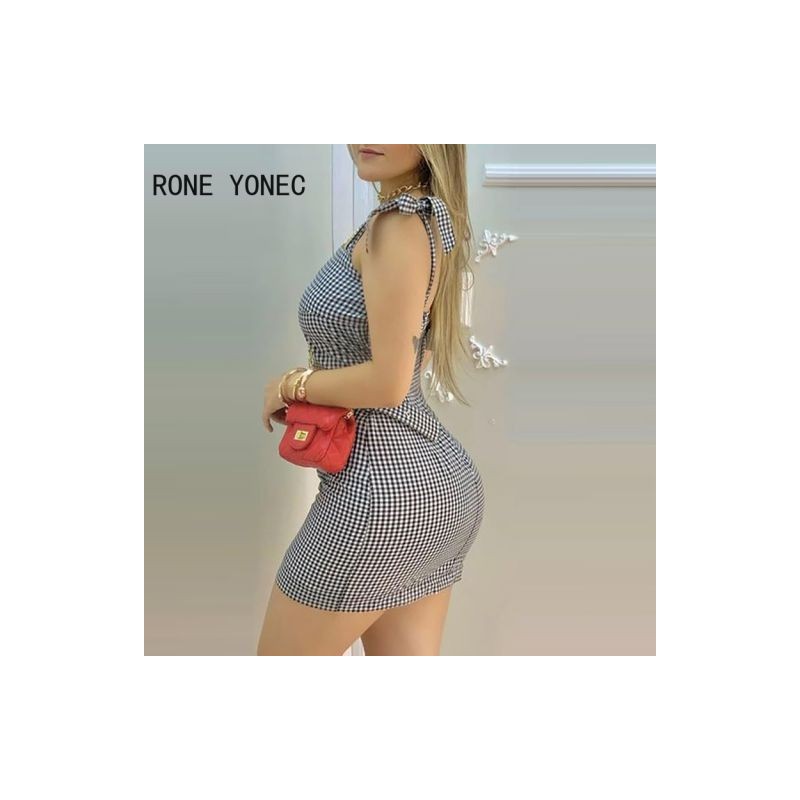 Women Elegant Dress Tied Shoulder Plaid Mini Dress With Waist Belt Casual Dress Summer Dress