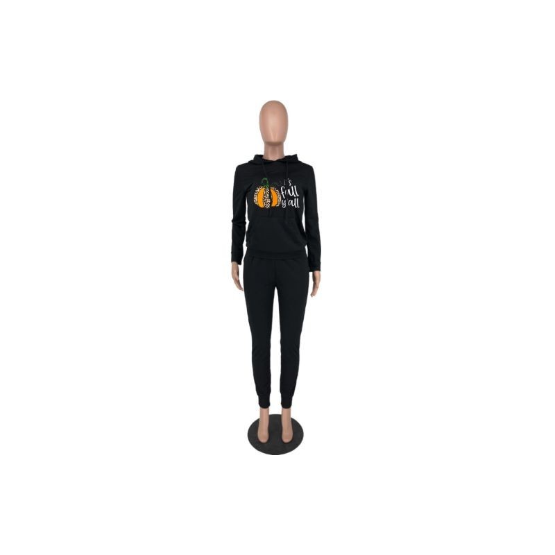 Halloween Pumpkin Print Women's Sweatsuits Casual Hooded Neck Long Sleeve Pullover and Drawstring Waist Workout Trouser Outfits
