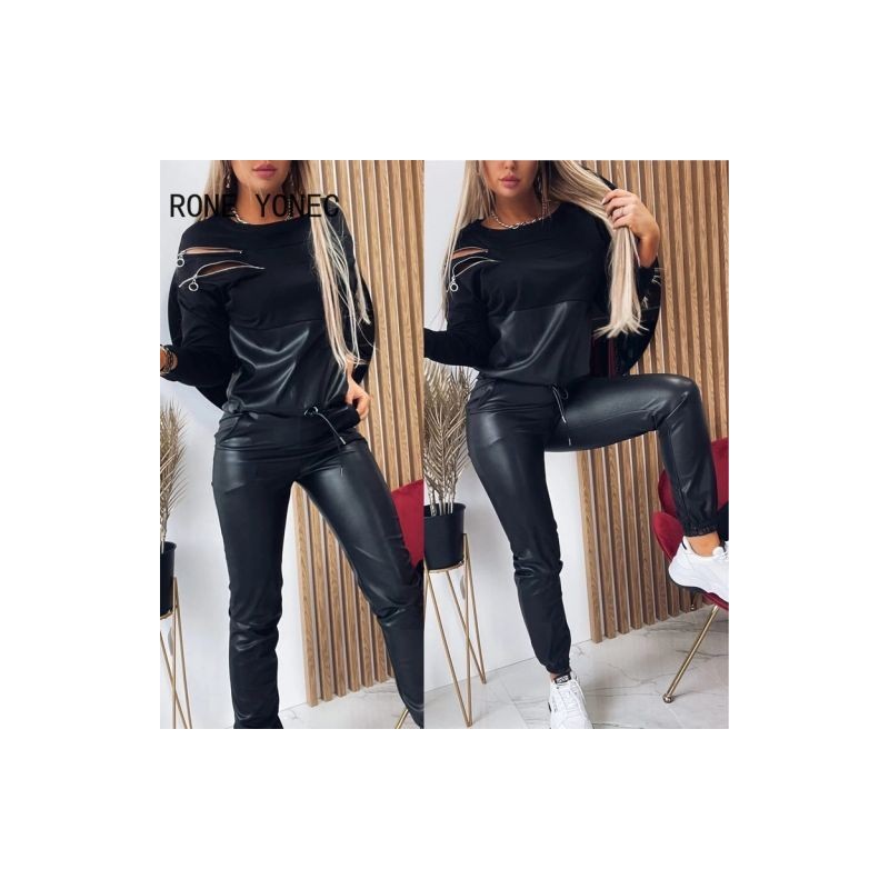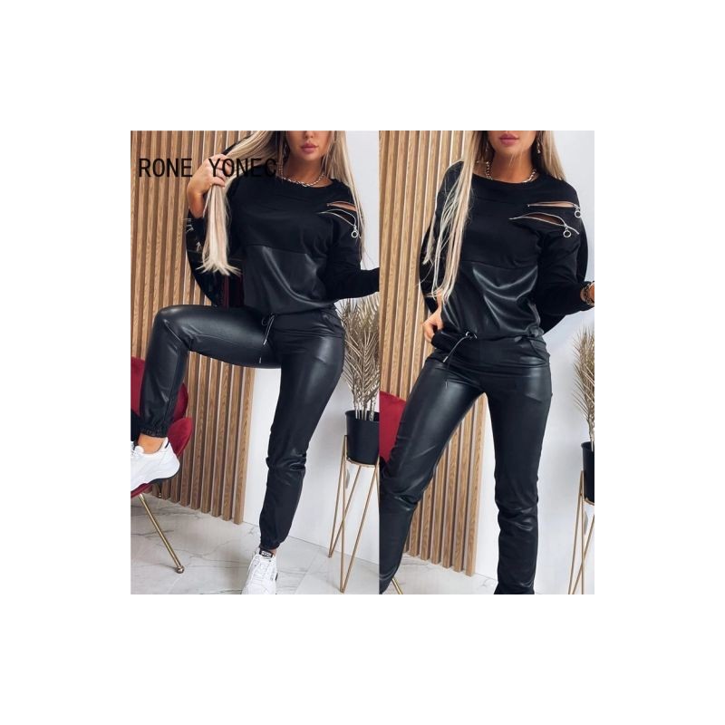 Női masszív alkalmi PU bőr patchwork cipzár hosszú denevér ujjú melegítő készletek