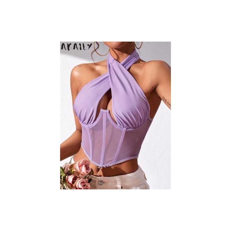 Akaily nyári hálós patchwork Crop Top klubruha női 2023-as szexi, ujjatlan kötőfékű, áttetsző női, üreges felsők