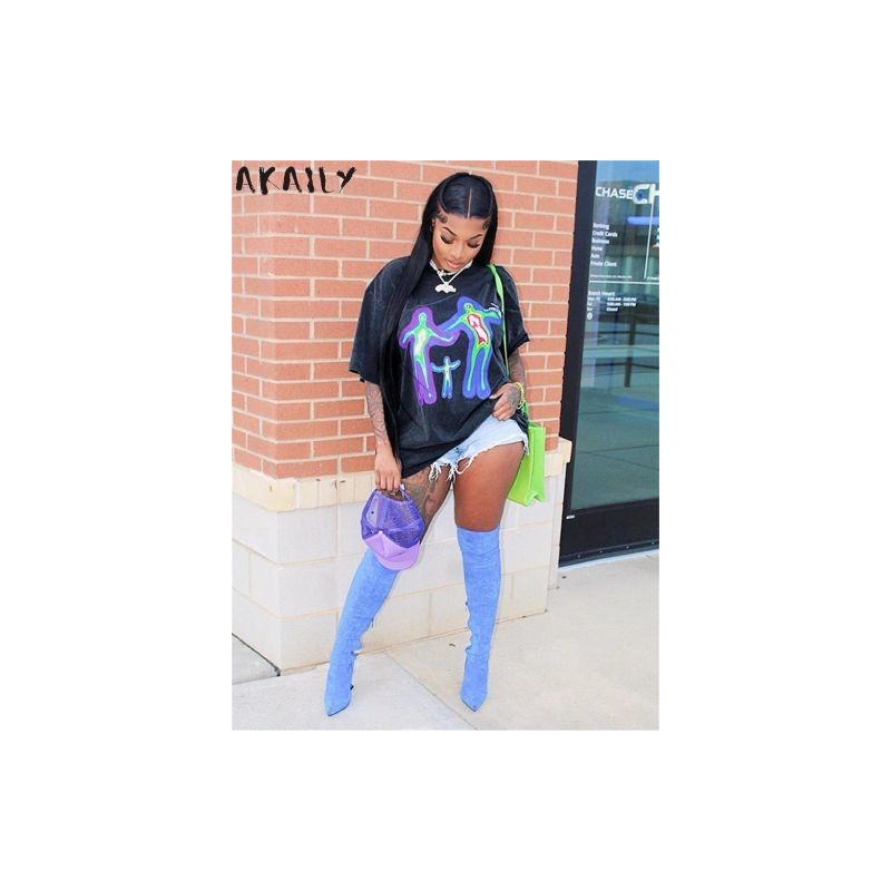 Akaily Summer Loose Black Graphic Printing T-shirts For Women 2023 Streetwear Casual O Neck Tees Fashion Party Tops Female