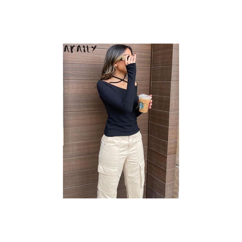 Akaily őszi fekete fűzős pólók női divatos 2022-es kötőfék hosszú ujjú fehér Y2K felsők, női alkalmi, egy vállú karcsú felső